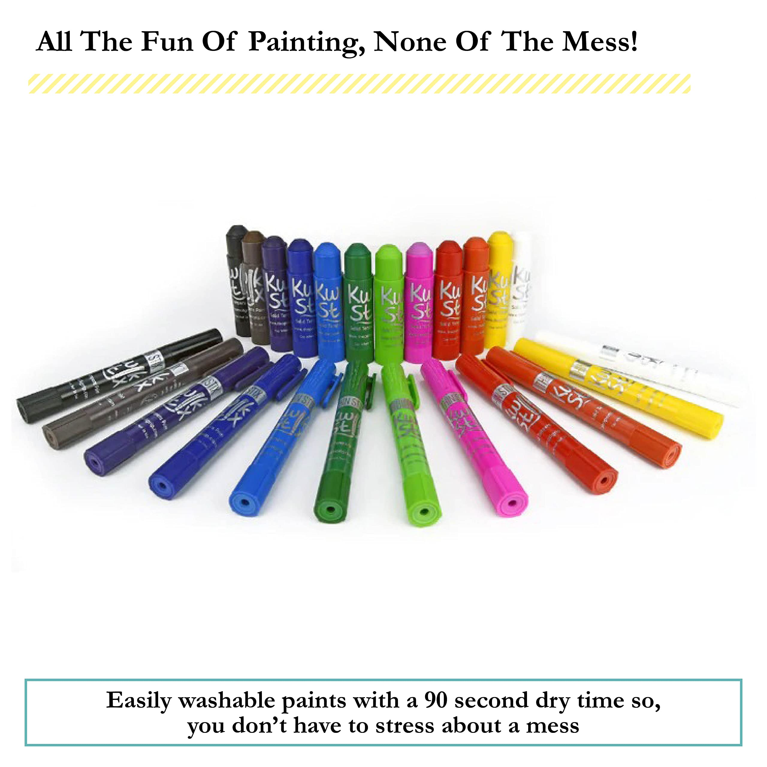 - Washable Paints for Children: No cups, smocks, water or brushes are required when using these washable paints. These tempera paint pens easily wash off so you don’t have to stress about a mess!